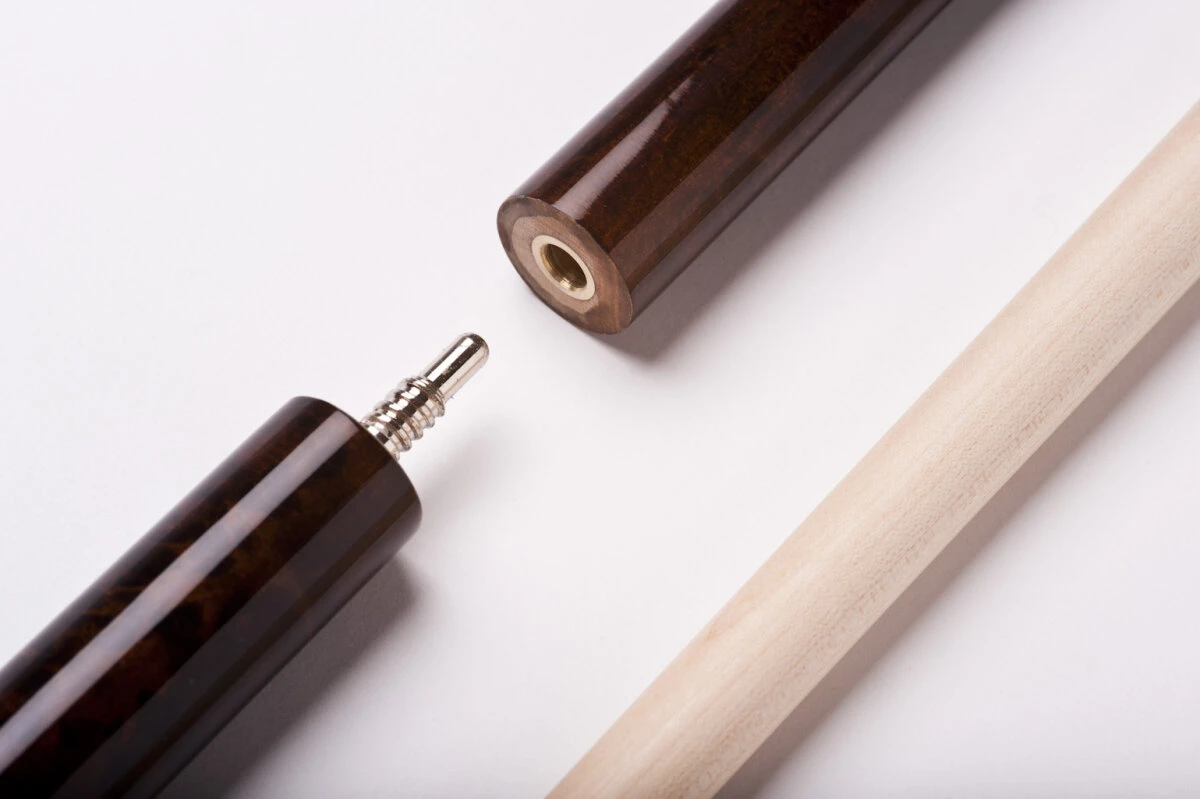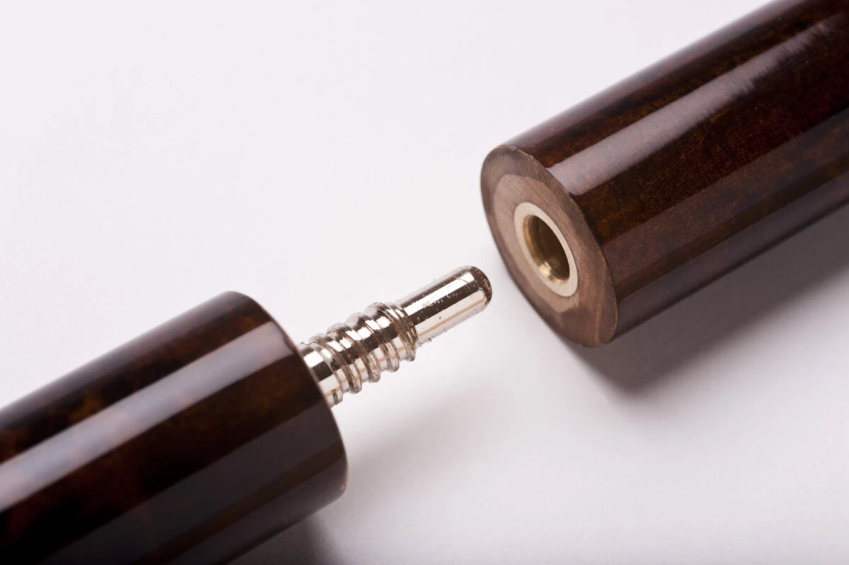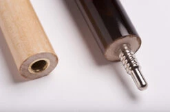 Das Break-Jump-Queue „Powerbreak“ gibt es in mehreren Designs. Das Modell „Dunkelbraun“ ist in einfachem dunkelbraun gestaltet. Es verfügt über ein hartes Oberteil mit besonderem Schliff sowie eine schwarze Bakelit-Ferrule. Damit ist das Break besonders hart und trotzdem kontrolliert. Dank der weiteren Teilung des Unterteils und der Kunststoff-Ferrule führen Sie Jump-Shots einfach und kontrolliert aus. Beide Gewinde sind mit einem Schnellverschluss versehen und damit schnell abschraubbar.