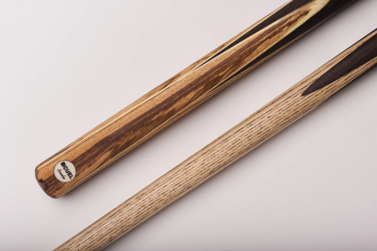 Ein schönes Einsteiger-Queue in schlichtem, klassischem Design mit 9,5mm breitem Qualitäts-Klebeleder. Auch zu diesem Preis erhalten Sie dieses Queue schon mit echt gesplicetem Dekor. Das heißt, dass die dunklen Spitzen („Splices“) durch Verleimung verschiedener Hölzer entstehen und nicht aufgemalt oder geklebt sind. Zusätzlich hat dieses Queue echte Splices am Unterteil, welche die schöne Verzierung mit wechselnden Hölzern erzeugen. Das Queue ist 3/4-geteilt und benötigt zum Transport somit einen entsprechenden Snooker-Koffer.