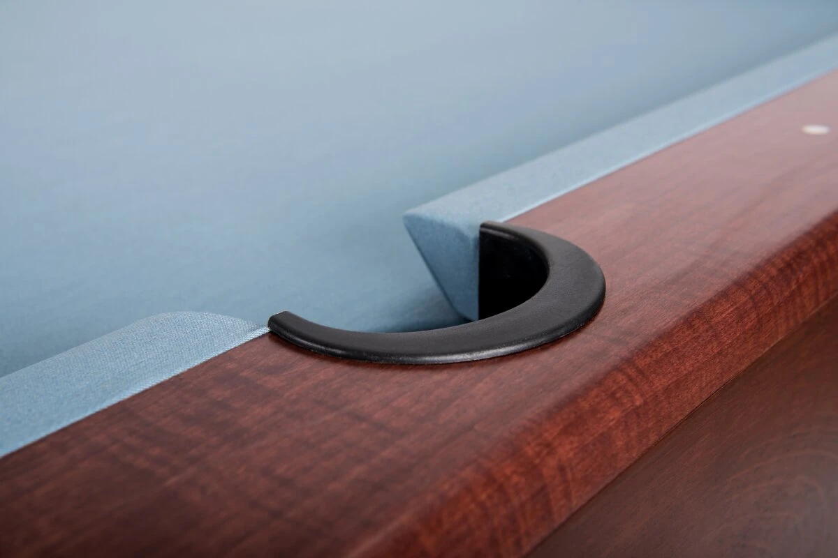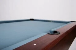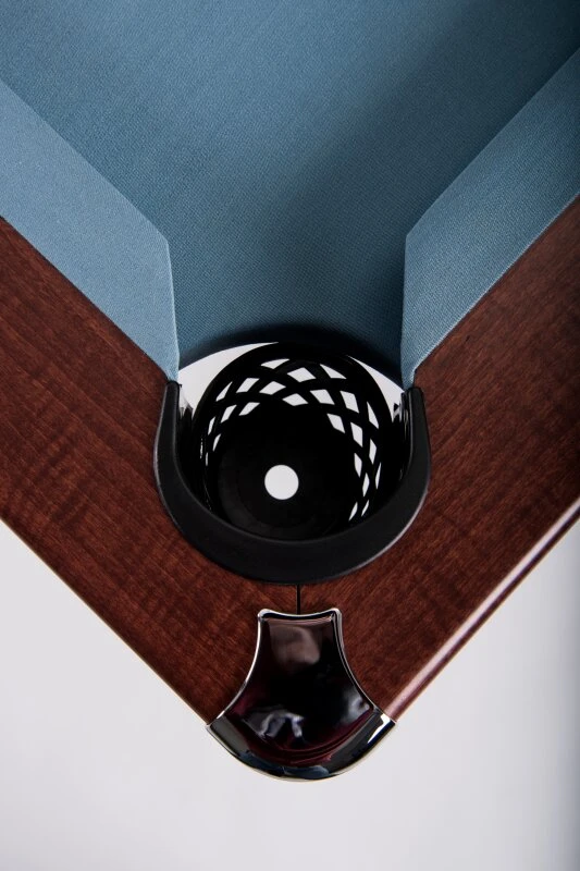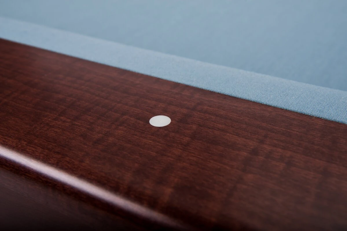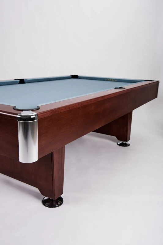 Der Bandenrahmen dieses Billardtisches ist mit einer besonders schlag- und kratzfesten Beschichtung aus HPL (wird auch für Küchenarbeitsplatten verwendet) versehen. Auch die Seitenblenden, die Füße sowie der Querträger sind aus massivem Holz gefertigt und bestechen durch das edle braune Design. Anders als bei optisch ähnlichen Modellen sind die Kappen an den Ecktaschen aus Metall und nicht aus Kunststoff gefertigt. Am Cuel Sport werden Sie lange Freude haben.