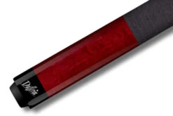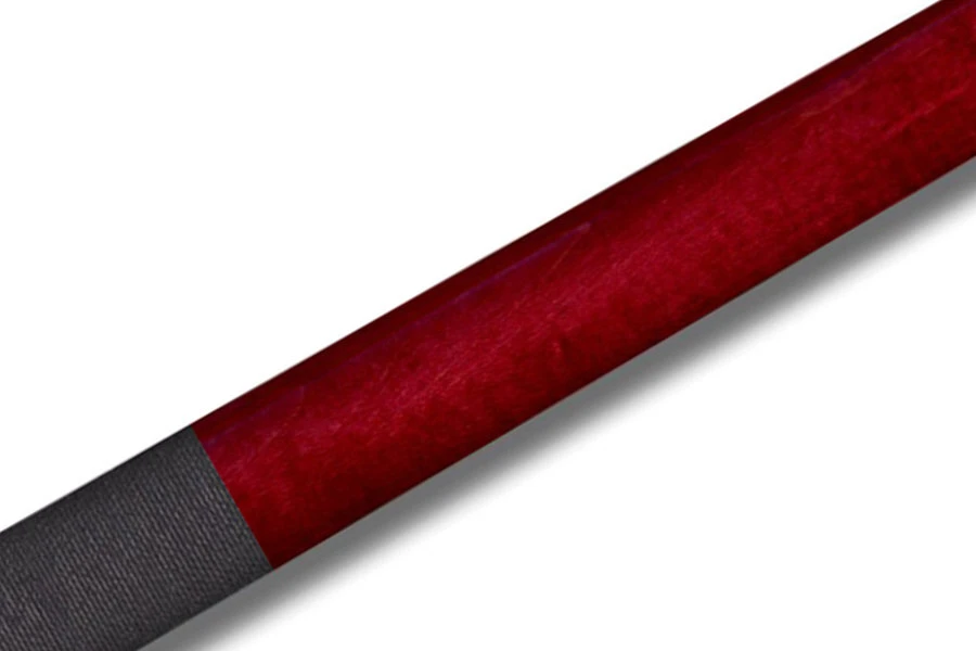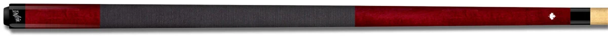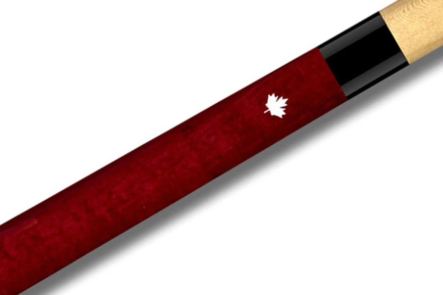 Einfaches, blutrotes Queue mit silbernem Ahornblatt-Logo und schwarzem Griffband aus irischem Leinen.