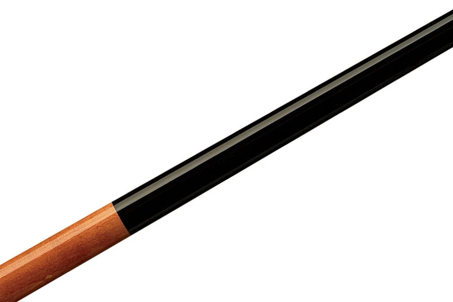 Einfaches, nachtschwarzes Queue mit silbernem Ahornblatt-Logo und edlem lackierten kirschholz-gebeiztem Griffbereich.