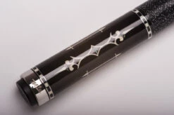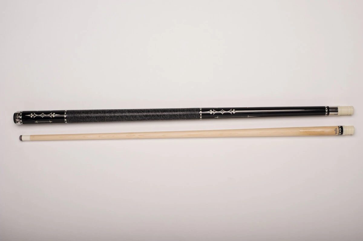 Sehr schönes, traditionelles Design mit Einlegeoptik. Das Design wird mit einer Folie geklebt und überlackiert; so entsteht die Optik von hochwertigen Einlegearbeiten. Die schönen Zierringe am Griffband und am Gewinde veredeln das Erscheinungsbild zusätzlich. Wir haben hier eine zuverlässige 3/8×10-Verschraubung mit Holzgewinde für beste Kraftübertragung beim Stoß. Das Griffband besteht aus einer Leinenwicklung aus irischem Leinen. Bei diesem Modell wurde eine Ferrule japanischer Herstellung verarbeitet und mit einem Triangle-Qualitätsleder versehen. Rostfreies Metall am Ende des Queues macht den besonderen Eindruck komplett. Lieferung inkl. Gewindeschoner zum Schutz Ihres Queues.