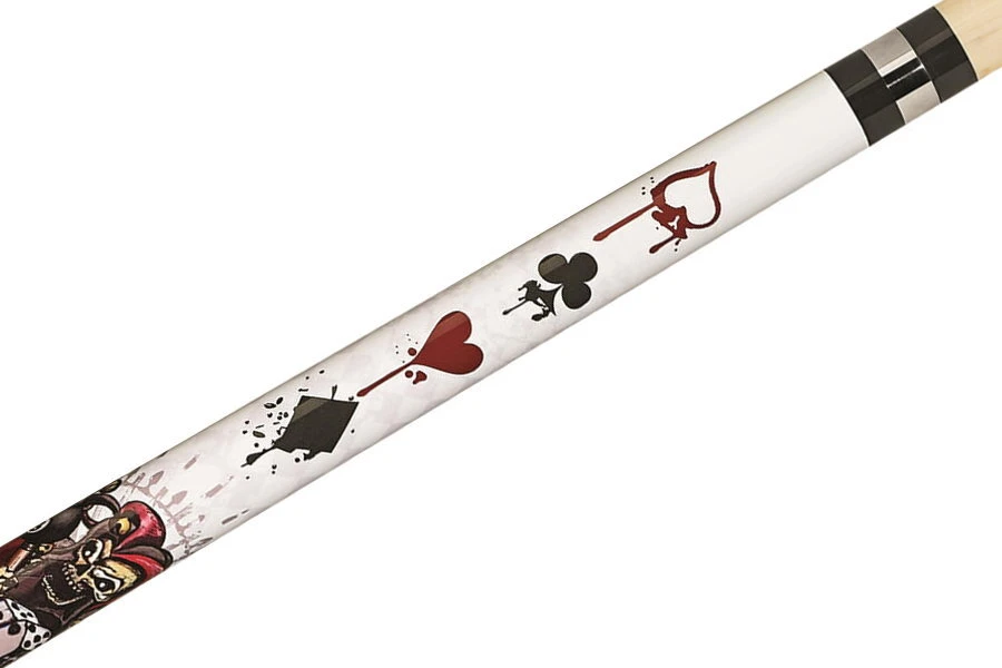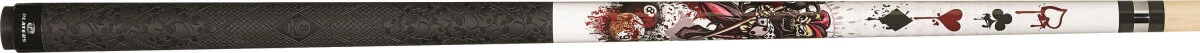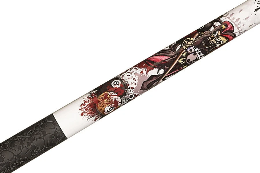 Dieses Pool-Queue mit weißem Forearm ziert ein cooles Motiv mit einem fiesen billardspielenden Joker im hinteren Teil und einem Spielkarten-Design. Das gummierte schwarze Griffband mit Multi-Zone-Traktion ist mit einem Totenkopf-Muster versehen.