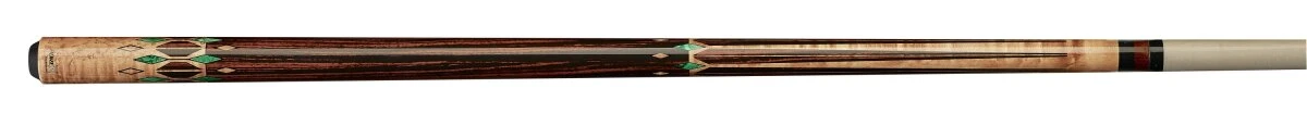 Golden gebeiztes Queue im antiken Look aus Vogelaugen-Ahorn mit verzierenden Designarbeiten in grĂŒn. Ohne Griffband und mit dem neuen HXT-Low-Deflection-Oberteil.