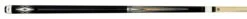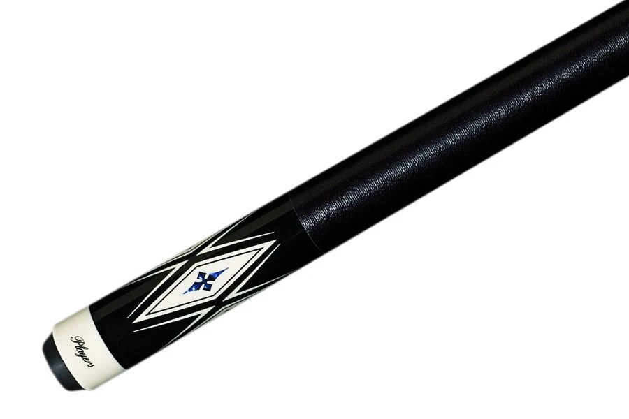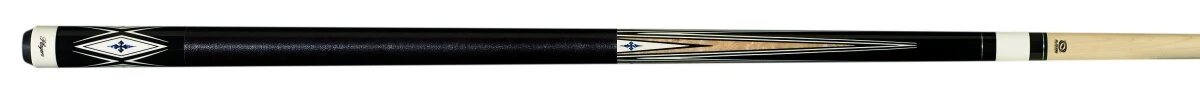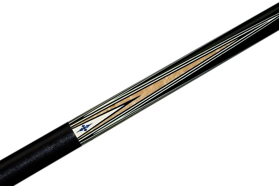Nachtschwarz gebeiztes Queue aus Vogelaugen-Ahorn mit Points in Naturahorn und weißen und kobaltblauen Designs. Versehen mit einem Griffband aus doppelt gepresstem irischen Leinen in schwarz und dem neuen HXT-Low-Deflection-Oberteil.