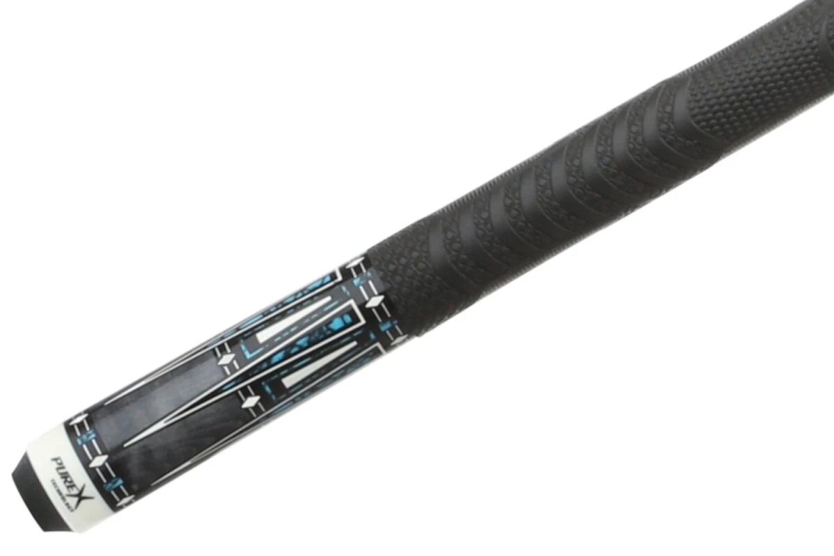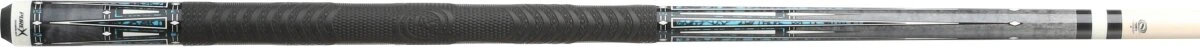 Grau gebeiztes Queue aus Riegelahorn mit Designelementen in Hellblau und Knochenimitat-Optik, mit Kamui-Leder und sportivem Griffband aus ergonomischem Gummi für perfekten Grip. Natürlich mit dem modernen HXT-Low-Deflection-Oberteil.