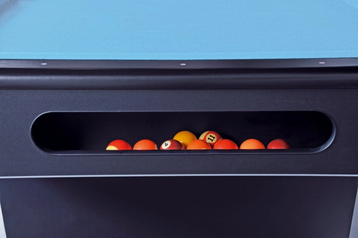 Dafür spricht auch sein hochwertiges ( schwarzes ) Außendekor, welches aus schlag- und kratzfesten Obermaterial besteht. Der Billardtisch ist mit geräuscharmen Einfalltaschen (Pockets) ausgestattet und hat an der Stirnseite eine nützliche Ballablage integriert.