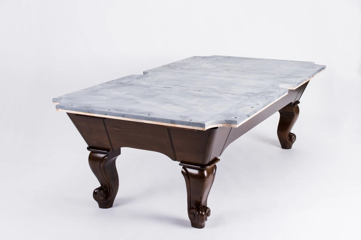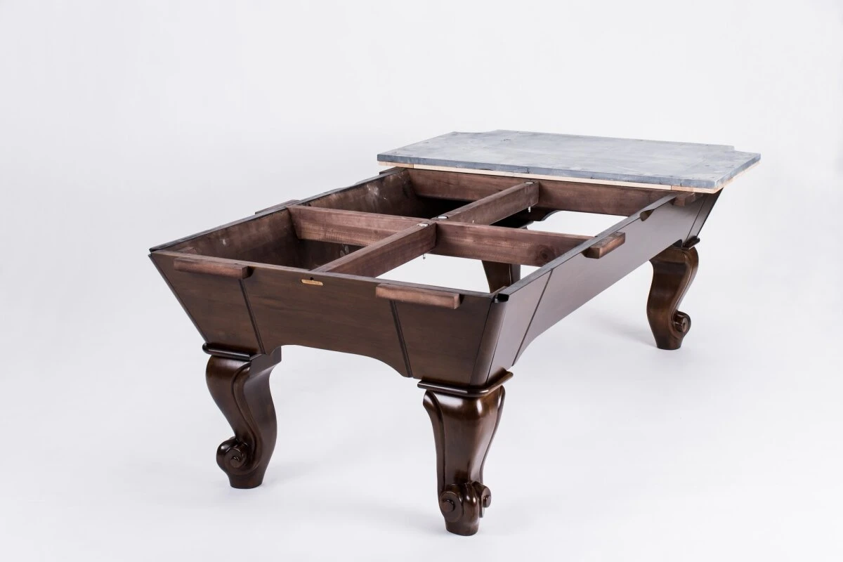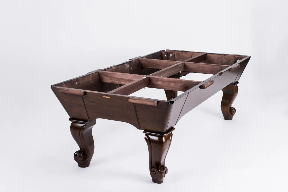 Die vier massiven Füße des Billardtisches sind die Grundvoraussetzung für den stabilen Stand des Untergestells. Die Unterkonstruktion aus massiven Holzträgern mit Justierschrauben, hat sich seit Jahren bei Turniertischen international als bewährter Standard etabliert. Der Tisch verfügt über eine dreiteilige, 2,5 cm dicke Schieferplatte und liefert damit den gleichen Standard und die gleiche Präzision wie Turniertische bei internationalen Wettbewerben. Wenn Sie also einen professionellen Tisch Ihr eigen nennen wollen, gleichzeitig auf klassisches Design nicht verzichten mögen, ist der Poolbillardtisch Charles Ihre perfekte Wahl.