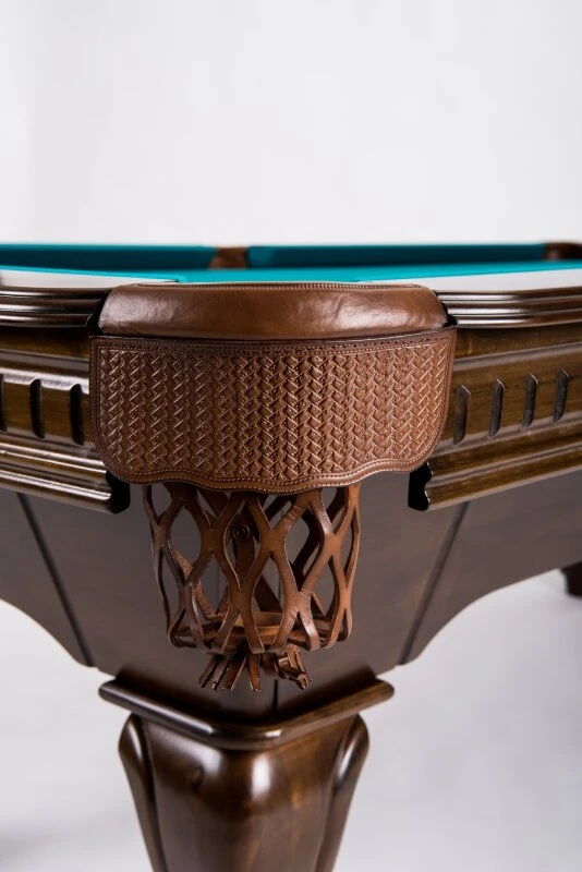 Der gesamte Tisch ist aus massivem Holz konstruiert und garantiert damit höchste Stabilität, Spielfreude und Langlebigkeit. Die Taschen sind aus echtem Leder gefertigt und unterstreichen die exklusive Note des Tisches. Die Oberfläche ist komplett lacklasiert in schwarz und Antikholz-Optik.