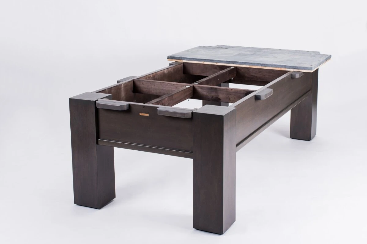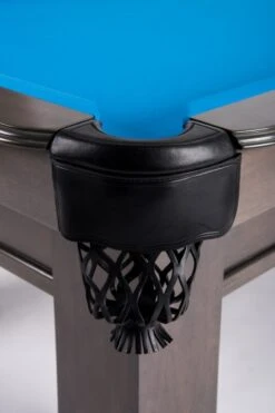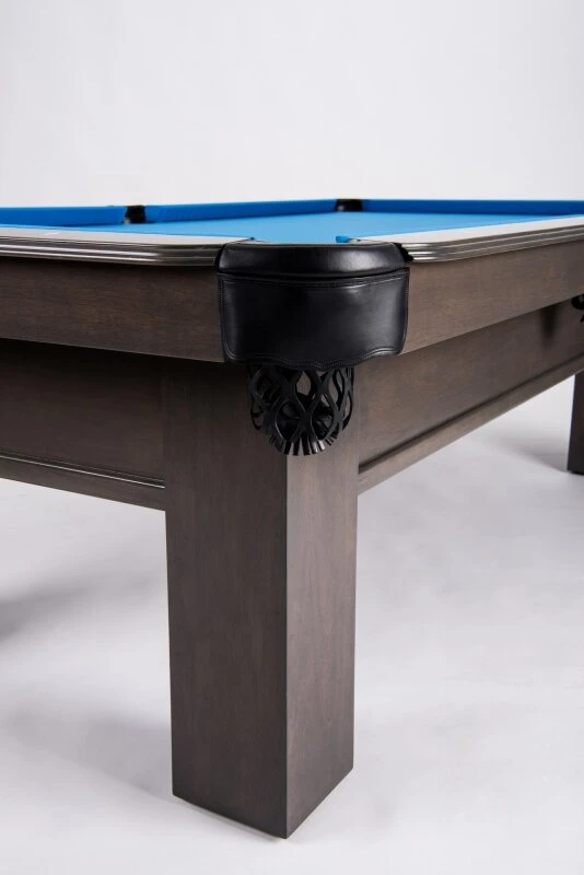 Der gesamte Tisch ist aus massivem Holz konstruiert und garantiert damit höchste Stabilität, Spielfreude und Langlebigkeit. Die Taschen sind aus echtem Leder gefertigt und unterstreichen die exklusive Note des Tisches. Die Oberfläche ist komplett in grau gebeizt.