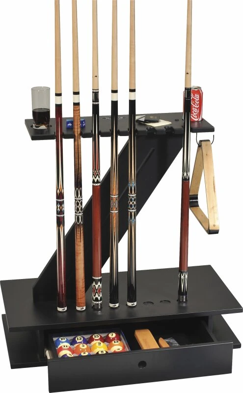 Dieser schicke Queueständer in „Z“-Form ist nicht nur unheimlich praktisch, sondern dabei auch ein echter Blickfang. Der schwarze hölzerne Ständer bietet Platz für bis zu acht Queues, hat eine Schublade zur Aubewahrung von Kugeln, Kreide und Billardzubehör und eine Aufhängmöglichkeit für Dreiecke. Obendrauf ist eine Ablagefläche, auf der sich z.B. Getränke abstellen lassen.